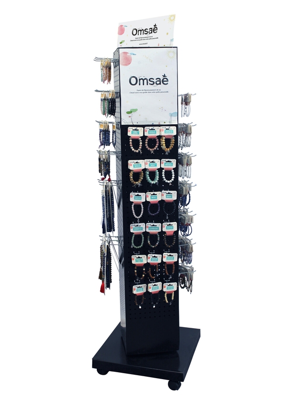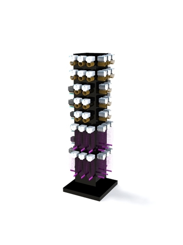 Tourniquet de sol en métal noir, pivotant et avec roulettes. Plaque plexiglas format A4 sur l'une des faces. 78 broches picots zinguées avec embouts noirs de 80 mm utile fournies. Format : 48 x 48 x 165,5 cm