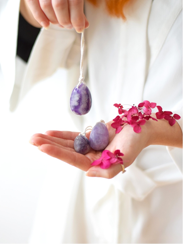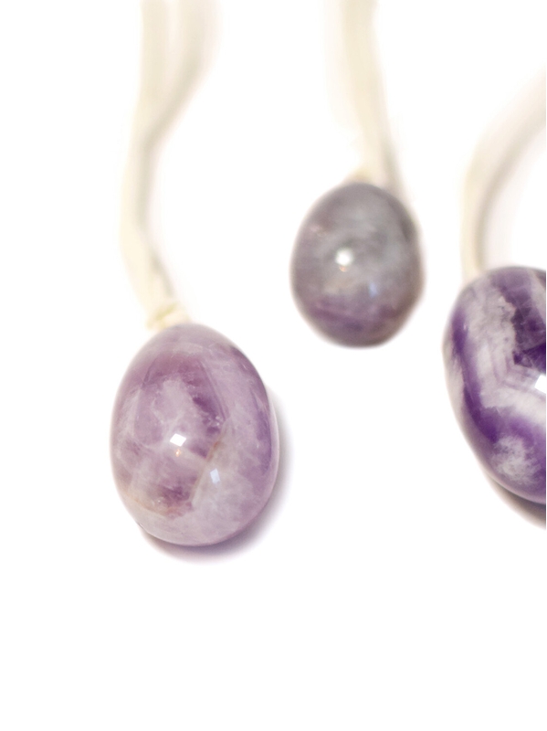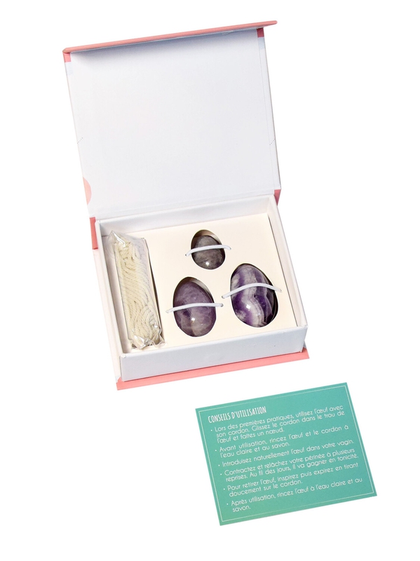 Coffret comprenant 3 oeufs de Yoni en pierre naturelle d'améthyste. Oeufs de tailles différentes destinés aux femmes souhaitant développer leur équilibre intérieur, la confiance et la vitalité intime. Hérité des secrets féminins chinois ancestraux, l'oeuf de Yoni est utilisé principalement pour tonifier les muscles du périnée. L'Améthyste, connue pour ses vertus anti-stress, viendra renforcer les bienfaits de l'utilisation des oeufs de Yoni.