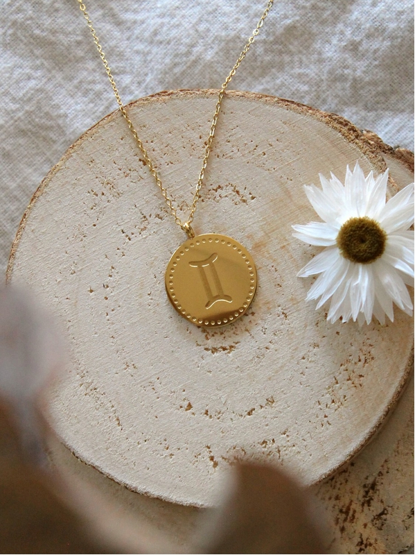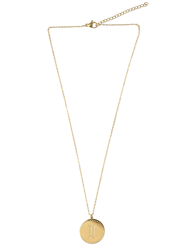 Collier composé d'une médaille gravée et d'une chaîne en acier inoxydable. Médaille gravée au recto et au verso avec le signe et la constellation Gémeaux. Chaîne ajustable d'une longueur de 40-45 cm.