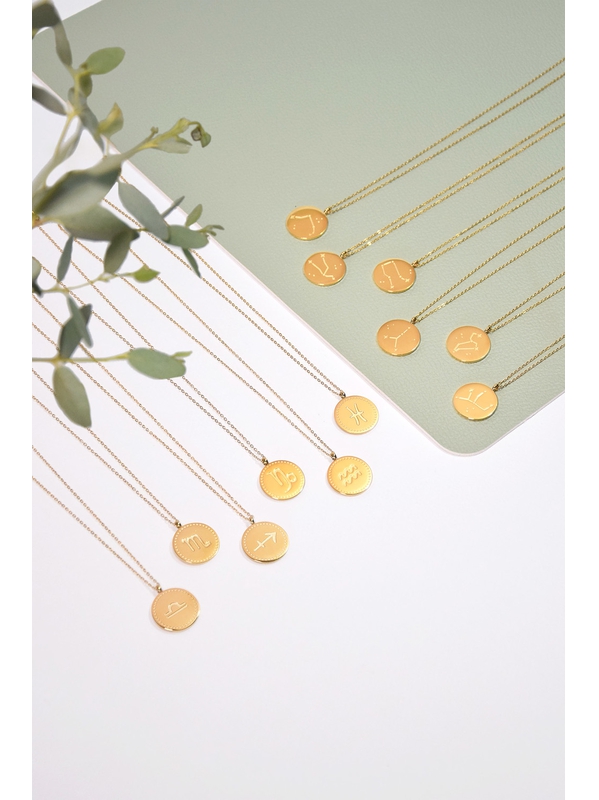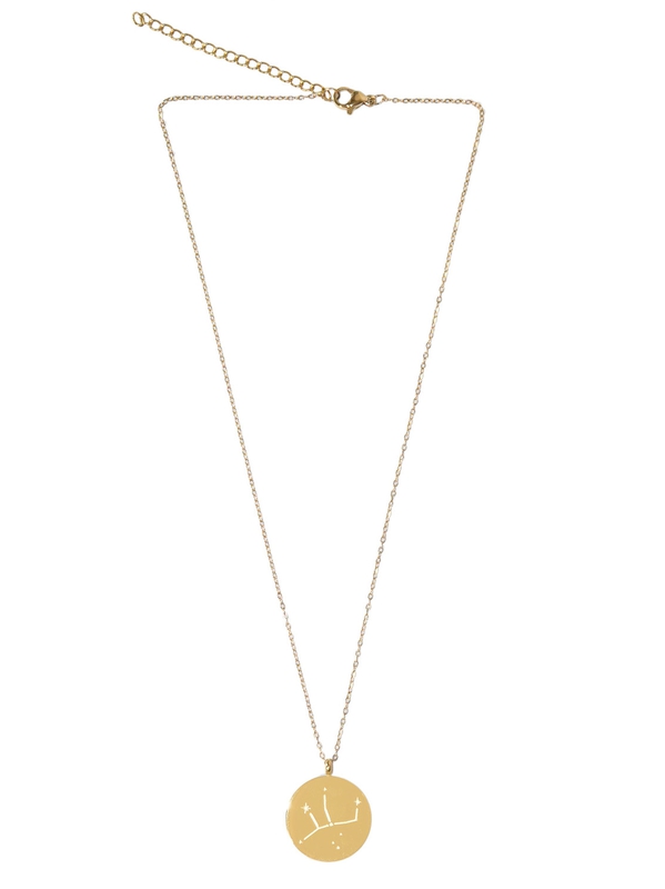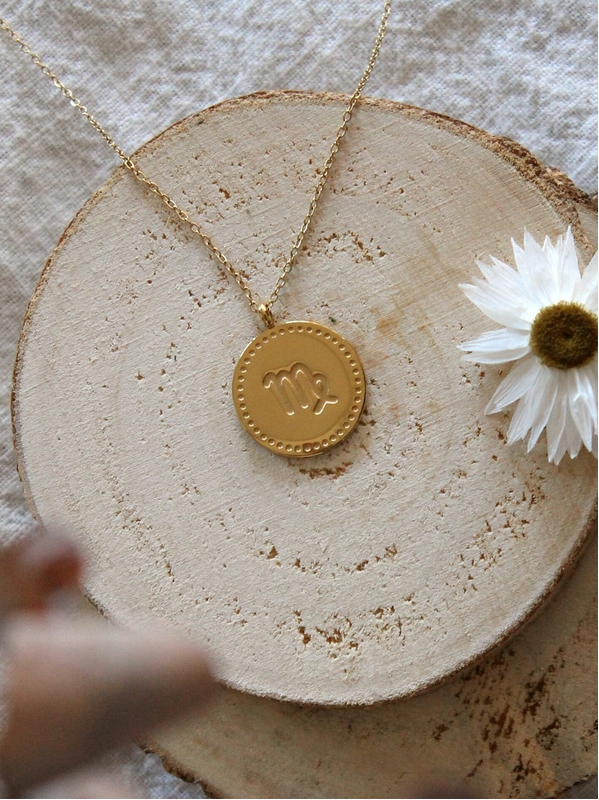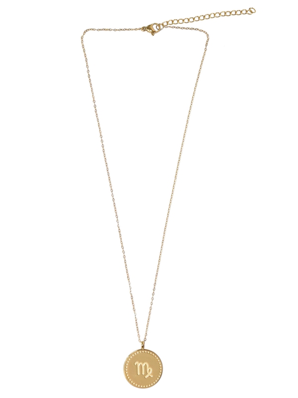 Collier composé d'une médaille gravée et d'une chaîne en acier inoxydable. Médaille gravée au recto et au verso avec le signe et la constellation Vierge. Chaîne ajustable d'une longueur de 40-45 cm.