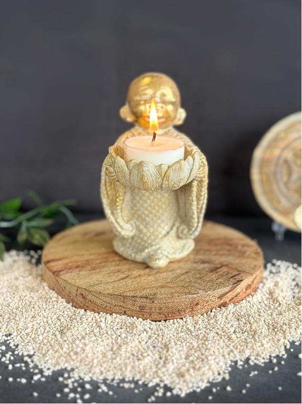 Porte-bougie Moine en Lotus 12,5 cm en Résine - Doré