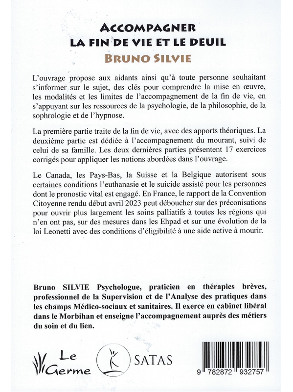 L'ouvrage propose aux aidants ainsi qu'à toute personne souhaitant s'informer sur le sujet, des clés pour comprendre la mise en oeuvre, les modalités et les limites de l'accompagnement de la fin de vie, en s'appuyant sur les ressources de la psychologie, de la philosophie, de la sophrologie et de l'hypnose. La première partie traite de la fin de vie, avec des rapports théoriques. La deuxième partie est dédiée à l'accompagnement du mourant, suivi de celui de sa famille. Les deux dernières parties présentent 17 exercices corrigés pour appliquer les notions abordées dans l'ouvrage.Silvie Bruno Voir moins