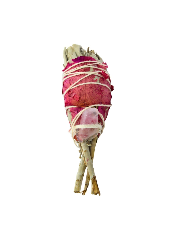 Boîte cartonnée contenant 1 bâton de sauge avec pétales de rose et une pierre véritable de quartz rose.
