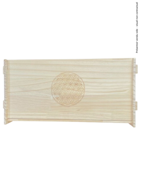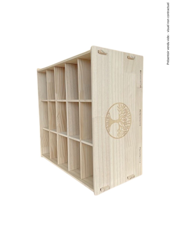 Présentoir en bois 15 cases pour bougies composé de 15 compartiments de 8 x 13cm (profondeur : 22cm). Dimensions du présentoir : 45 x 44 x 28cm. Motif arbre de vie sur les