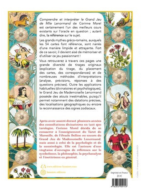 « Comprendre et interpréter le Grand Jeu de Mlle Lenormand » a pendant longtemps été le seul livre sur l'oracle en question, rapportant les légendes et mythes, en expliquant clairement la signification des cinquante-quatre cartes créées par Marie-Anne Lenormand au XIXe siècle. Aujourd'hui, bien que concurrencé, cet ouvrage de Corinne Morel reste la référence sur le sujet. La guerre de Troie, la Toison d’Or et autres grands mythes gréco-romains, sur lesquels le Tarot de Mlle Lenormand est basé et fait référence, sont narrés d’une manière limpide et attrayante. Fort de ce savoir, il devient aisé de mémoriser et d’utiliser ce jeu passionnant. À ses qualités symboliques, s’ajoute une grande diversité de tirages originaux (explication du tirage, du placement des cartes, des correspondances). Le lecteur trouvera de nombreuses méthodes d’interprétations (analyse, prévisions, réponses à des questions précises). Outre les applications habituelles (divinatoires et psychologiques), le jeu de Mlle Lenormand possède des atouts inestimables, entre autres la datation précise (avec une échelle de temps en jours, mois, années), la situation des lieux géographiques et la reconnaissance des signes zodiacaux.Morel Corinne Voir moins