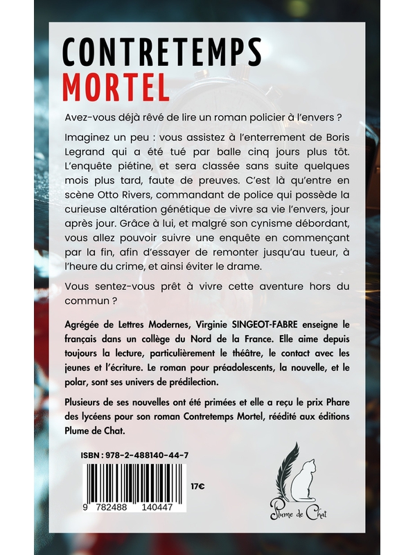 Avez-vous déjà rêvé de lire un roman policier à l’envers ? Imaginez un peu : vous assistez à l’enterrement de Boris Legrand qui a été tué par balle cinq jours plus tôt. L’enquête piétine, et sera classée sans suite quelques mois plus tard, faute de preuves. C’est là qu’entre en scène Otto Rivers, commandant de police qui possède la curieuse altération génétique de vivre sa vie l’envers, jour après jour. Grâce à lui, et malgré son cynisme débordant, vous allez pouvoir suivre une enquête en commençant par la fin, afin d’essayer de remonter jusqu’au tueur, à l’heure du crime, et ainsi éviter le drame. Vous sentez-vous prêt à vivre cette aventure hors du commun ?Singeot-Fabre Virginie Voir moins