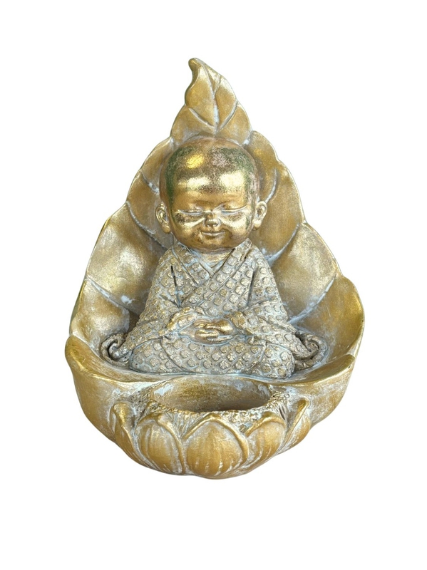 Enveloppé dans une feuille protectrice, les yeux clos, le moine repose dans une profonde méditation. Sa présence inspire la sérénité et la connexion à l'instant présent. Devant lui, un port-bougie attend la flamme. Réalisé en résine dorée, ce porte-bougie invite à la méditation, à l'écoute intérieure et à la paix profonde. Il trouve sa place dans une pièce de repos ou pendant des moments de calme et de méditation.